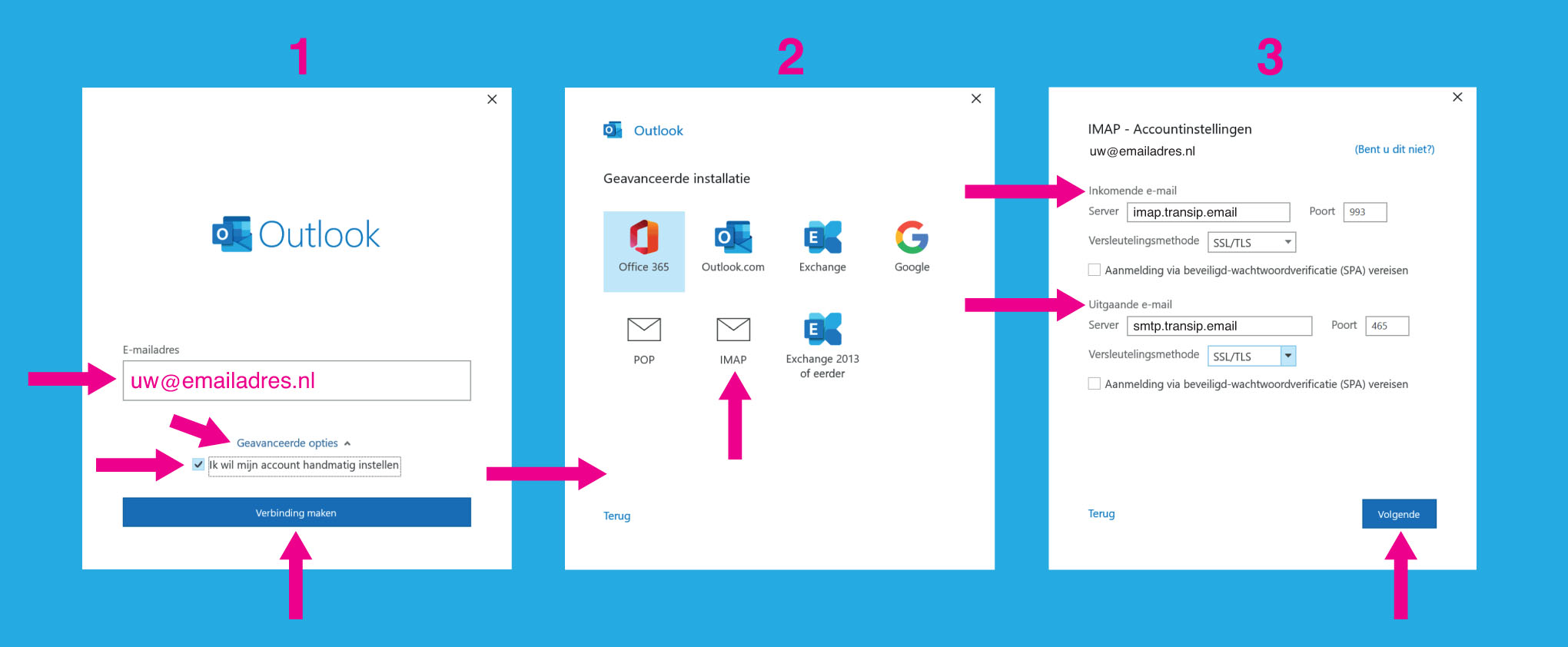 Let op: Heb je dit e-mailpakket al langer? Ga dan vóórdat je de nieuwe instellingen doet in je e-mailprogramma op je computer, eerst naar de nieuwe webmail met de volgende link: transip.email. Via de webmail zie je precies wat er daadwerkelijk aan e-mail en mapjes in je mailbox staat. Log in met je e-mailadres en je ontvangen wachtwoord en kijk of alles hier goed staat. Controleer met name mapjes die je zelf aangemaakt hebt en de inhoud daarvan. Sommige e-mailprogramma's zoals Outlook maken soms (jarenlang) fouten met synchroniseren, en dan staat niet alles wat je op je computer ziet, ook in de echte mailbox op de server. Hierdoor kun je na het instellen van de nieuwe gegevens mogelijk e-mail kwijtraken. Zie je in de nieuwe webmail niet alles en ontbreken er mapjes en e-mails? Dan werkt je e-mailprogramma waarschijnlijk niet naar behoren, en loop je risico om e-mail kwijt te raken. Maak zo snel mogelijk een backup van de e-mail op je computer zelf. (Als in de webmail gewoon alles compleet is, dan is er niks aan de hand natuurlijk.)